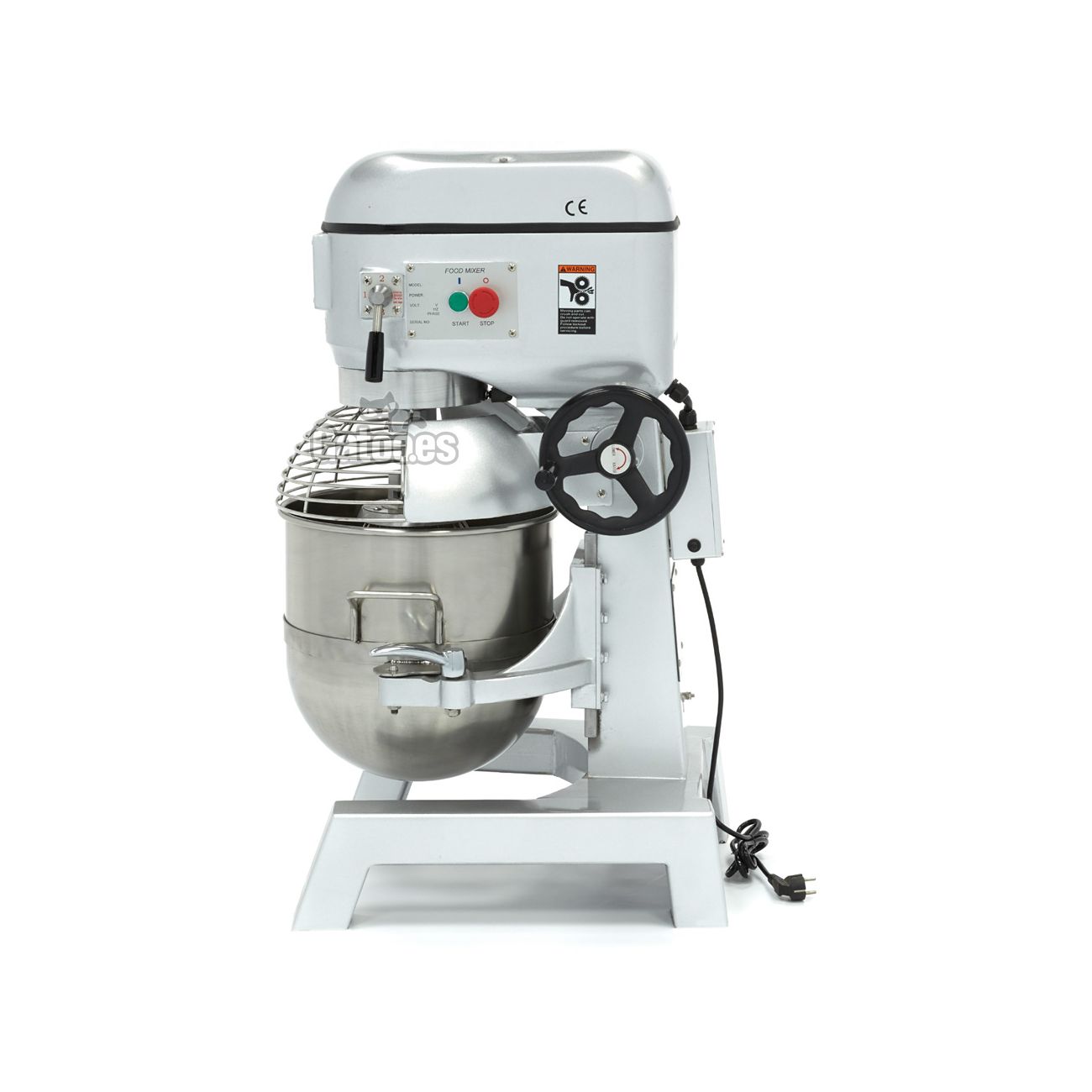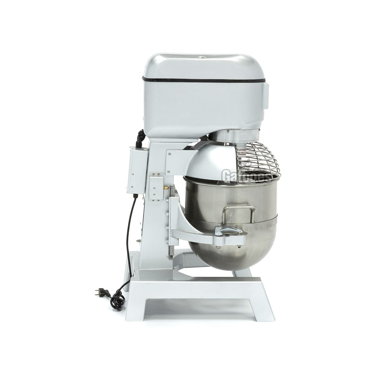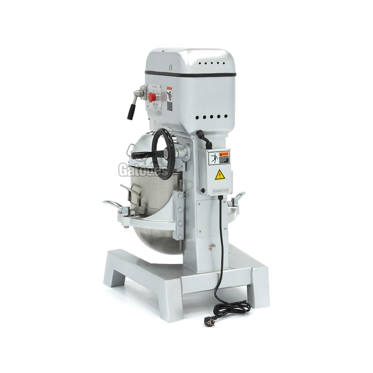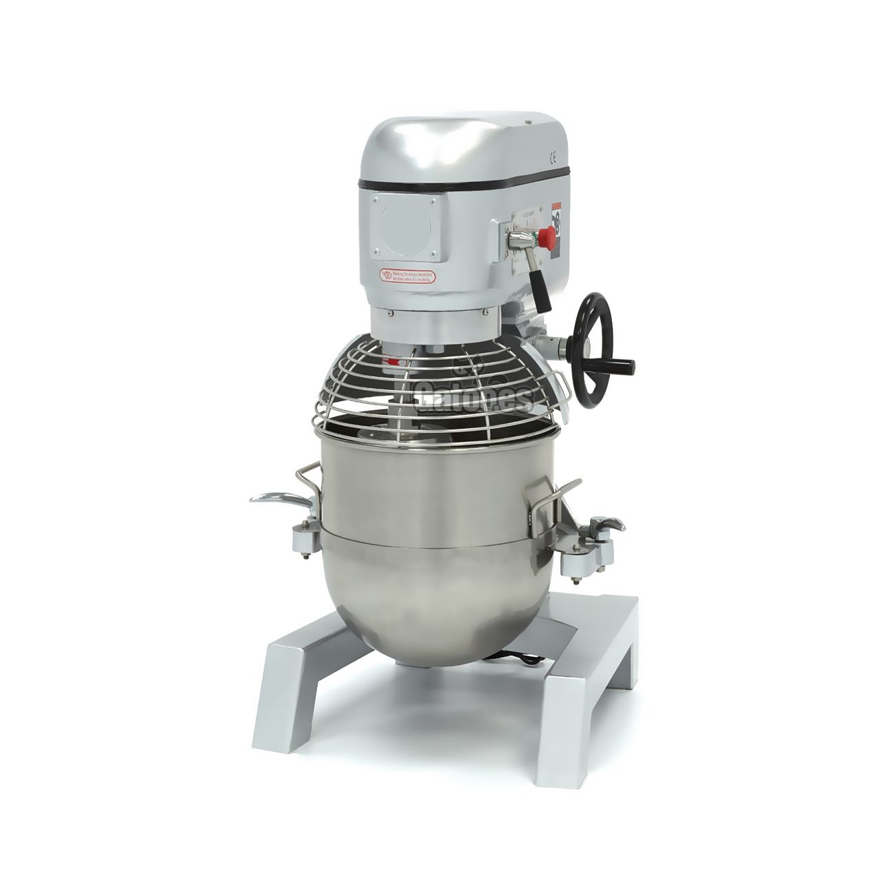 Cuenta con un sistema elevador de cuba a través de volante lateral. El bowl es extraíble y elevable. Integra botones de encendido y de parada independientes, con seta de parada de emergencia y rejilla de protección de seguridad de acero inoxidable, que evita que la máquina se ponga a trabajar si no está correctamente colocada. Transmisión por correas y robustos engranajes metálicos.