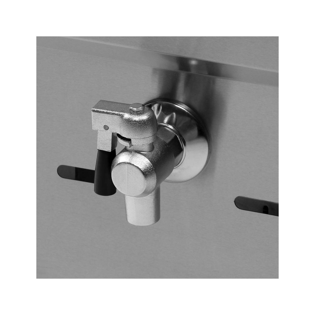 Para la limpieza rápida de los depósitos cuenta con grifos de vaciado en el frente de las cubas y la base tiene patas regulables en altura. Está preparada para usar con gas ciudad.