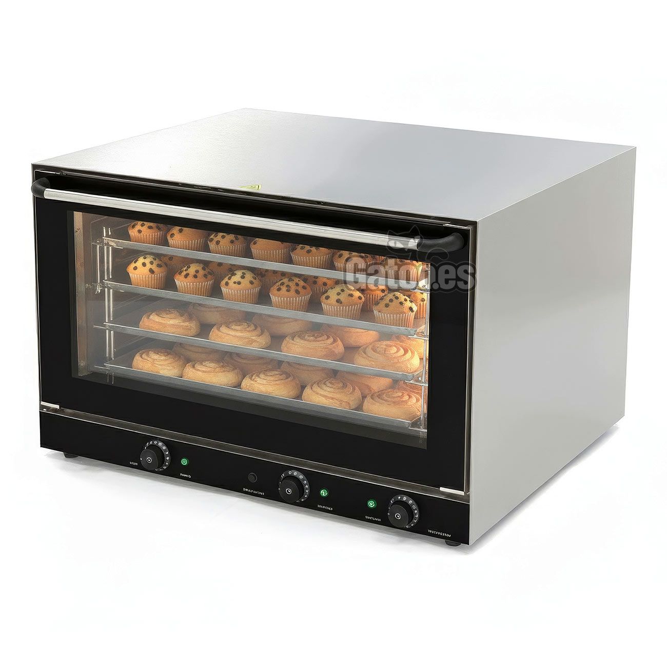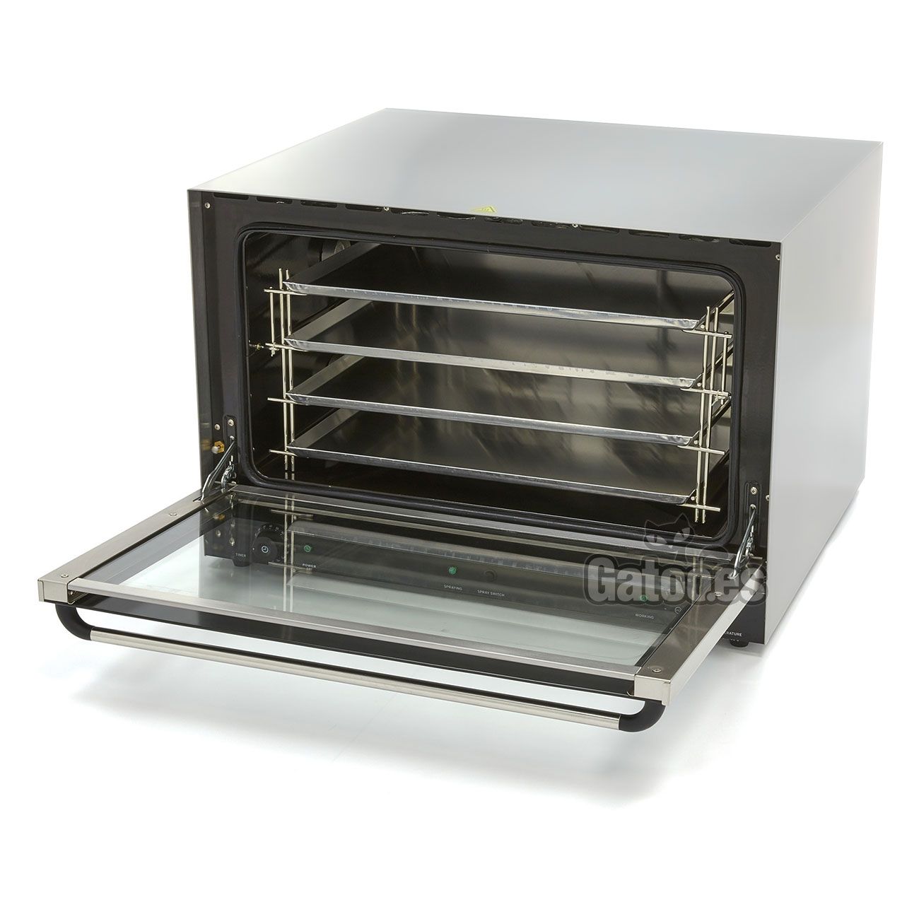 - Horno eléctrico industrial de Convección con Grill y Vapor. Reparto cicular del calor por convección y a través de las resistencias caloríficas. Gratinado por medio de las resistencias superiores para dorar. Vapor indirecto por inyección manual pulsando el botón frontal.