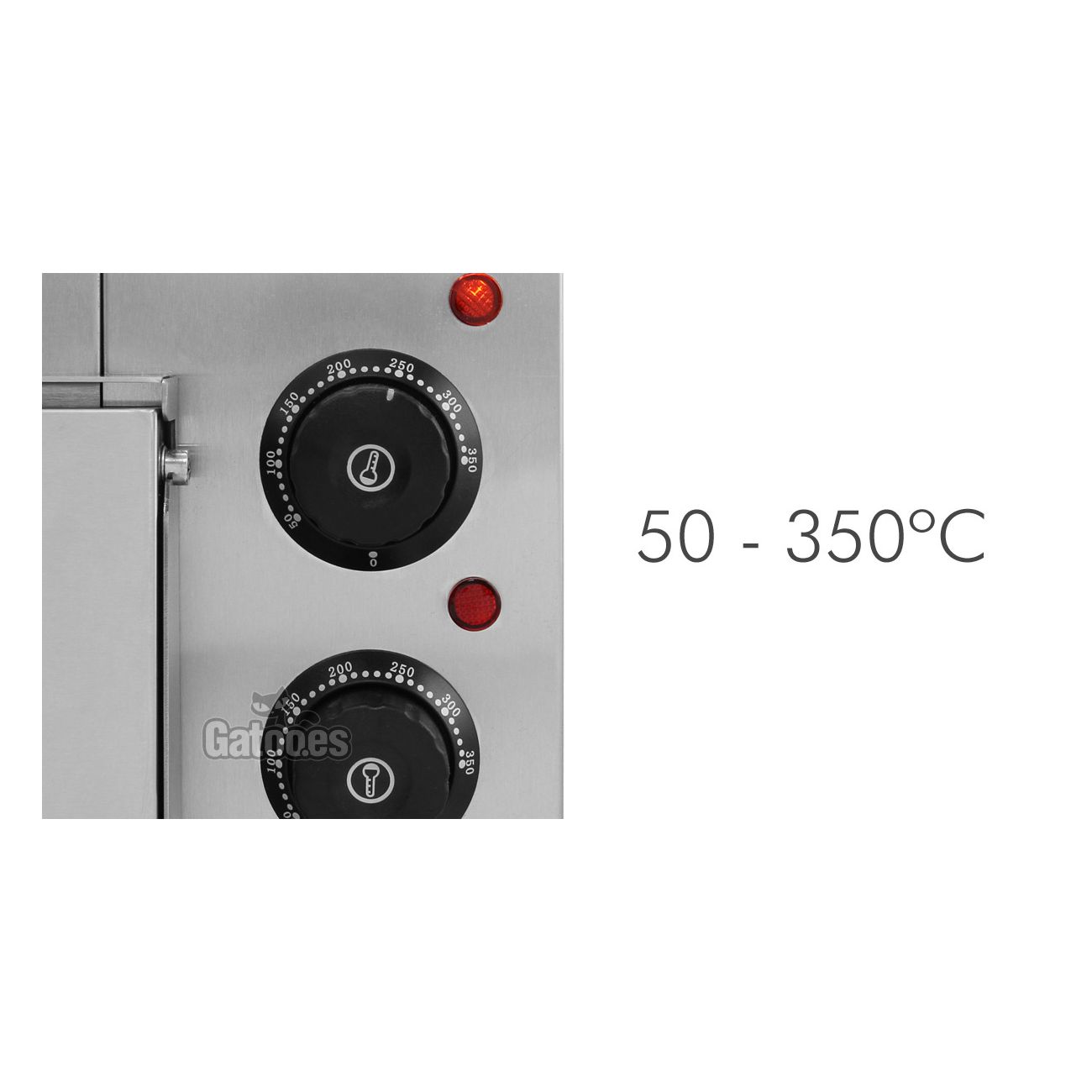 Doble regulador de temperatura para las resistencias superior e inferior, que alcanzan una temperatura máxima de 350ºC, además cuenta con temporizador. Por su base interior en piedra se consigue un punto de cocción en las pizzas muy crujiente.