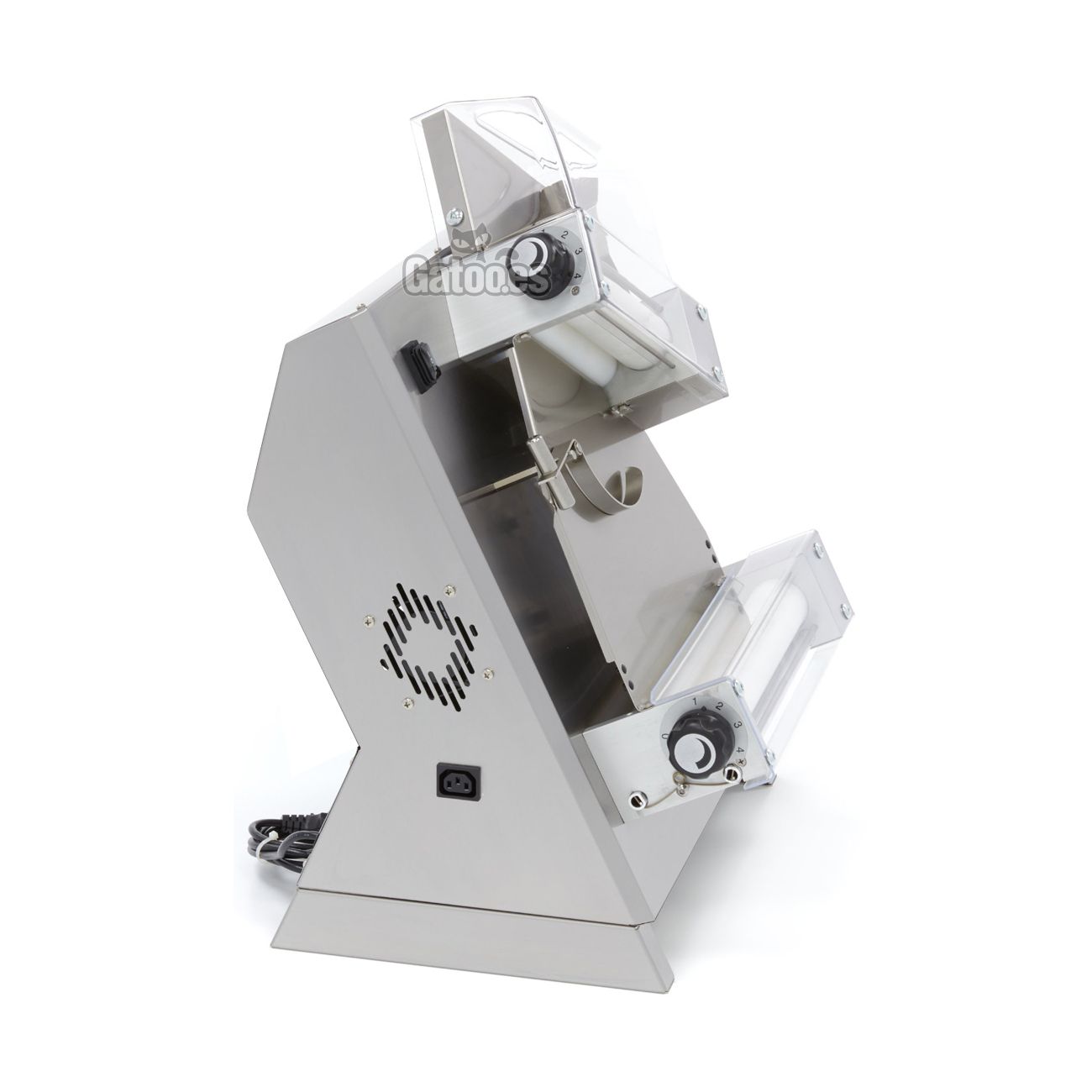 Esta laminadora para masas hace empanadas, quiches, cocas y pizzas con un diámetro de 14 a 30 cm. y un grosor de 4 mm. Prepara un máximo de 210 gramos de masa por operación. Además de no calentar la masa es muy sencilla de utilizar.