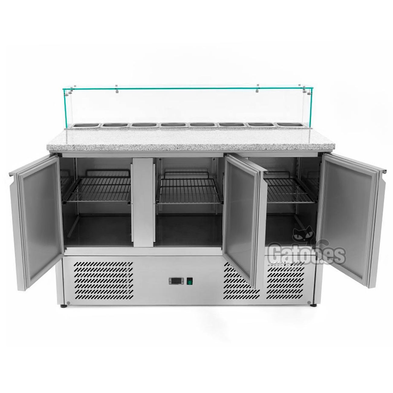 Esta mesa refrigerada es de 3 puertas con encimera de Granito para preparar deliciosas pizzas, empanadas, quiches, pastas, etc. La superficie de trabajo, el peto y laterales son en granito resistente de gran durabilidad. Se pueden adaptar 8 cubetas GN1/6 (NO incluidas cubetas ni tapas GN, puedes añadirlas más arriba) que van protegidas por una cúpula de acero inoxidable o de cristal (opcional, a elegir más arriba) y se incluyen los soportes de acero inoxidable para cubetas GN.
