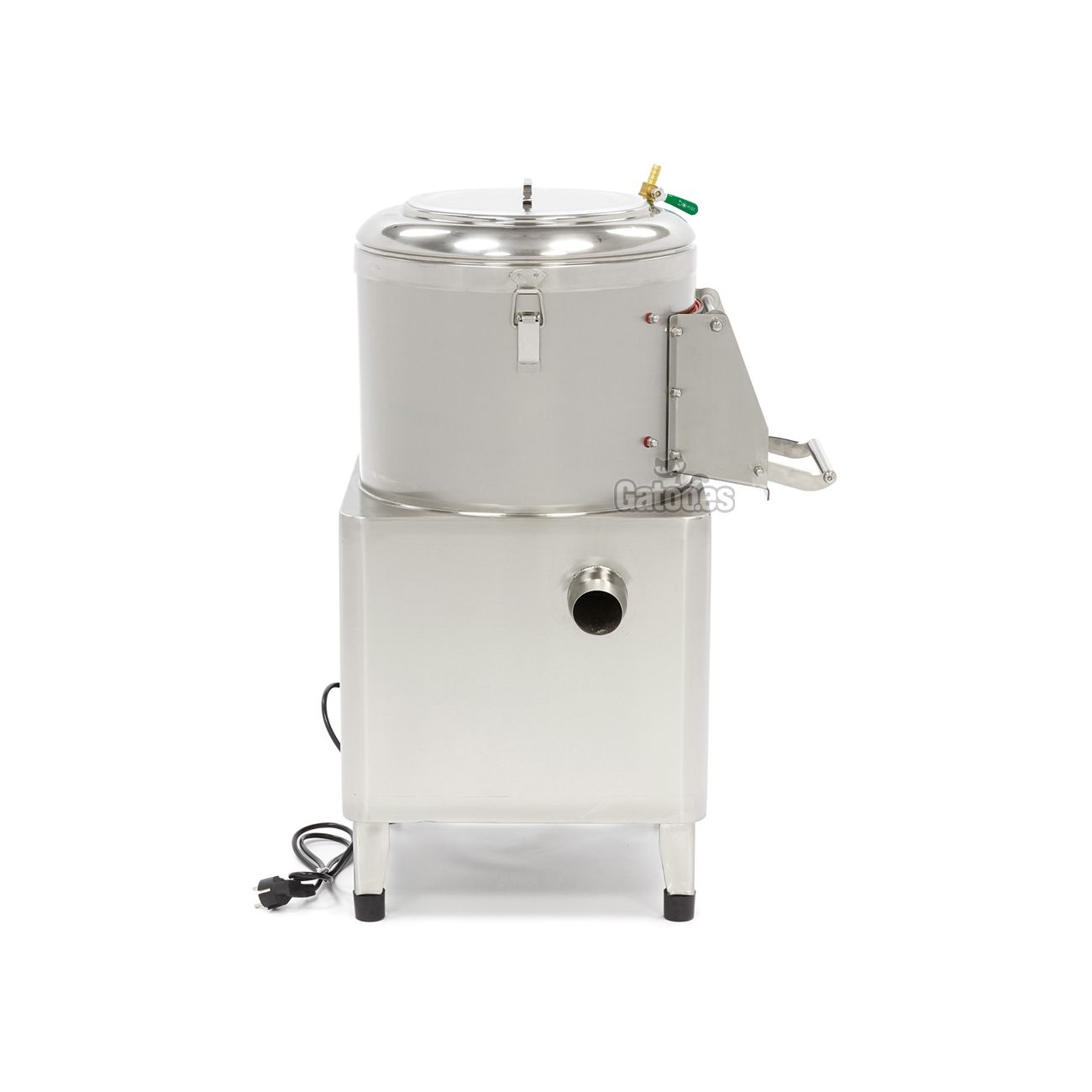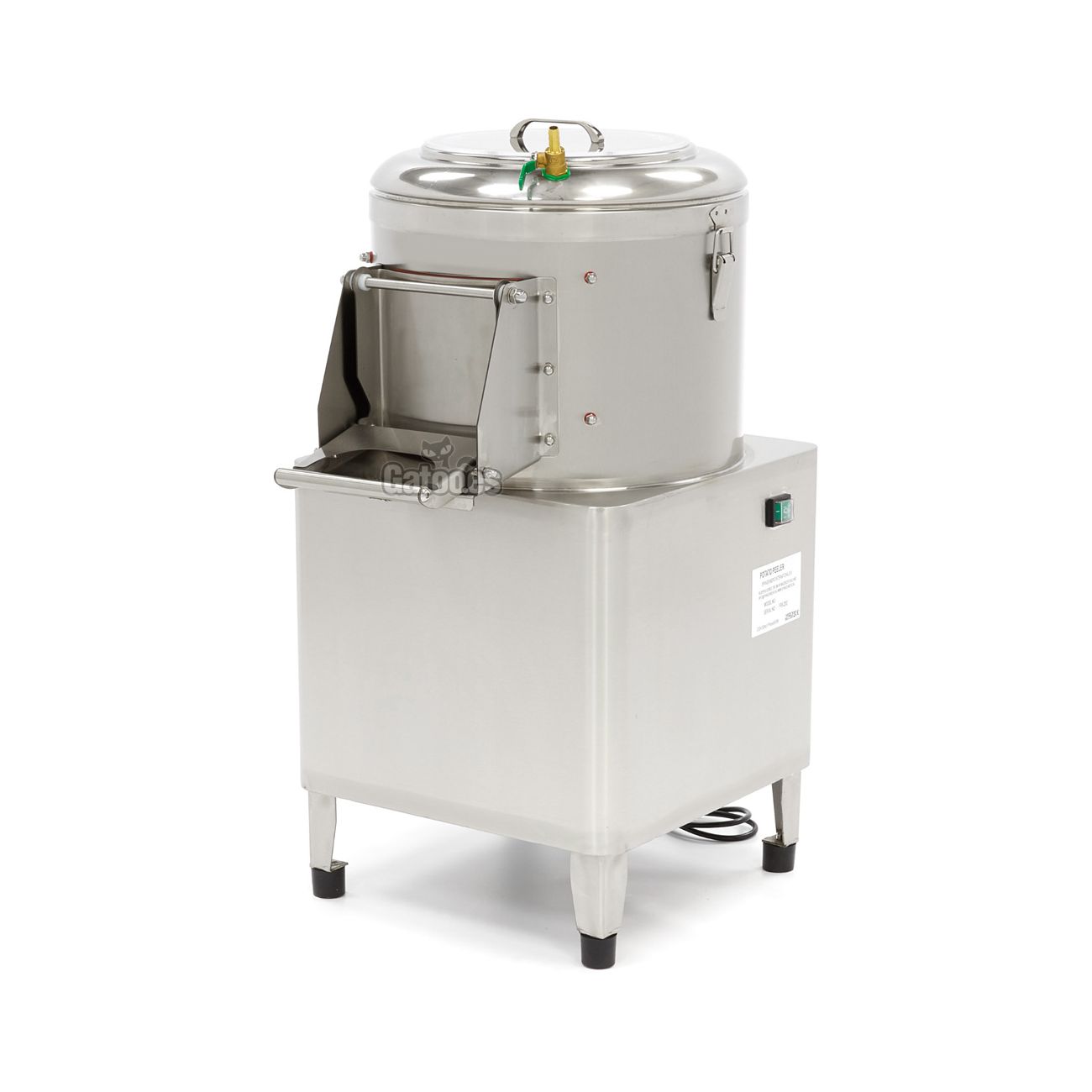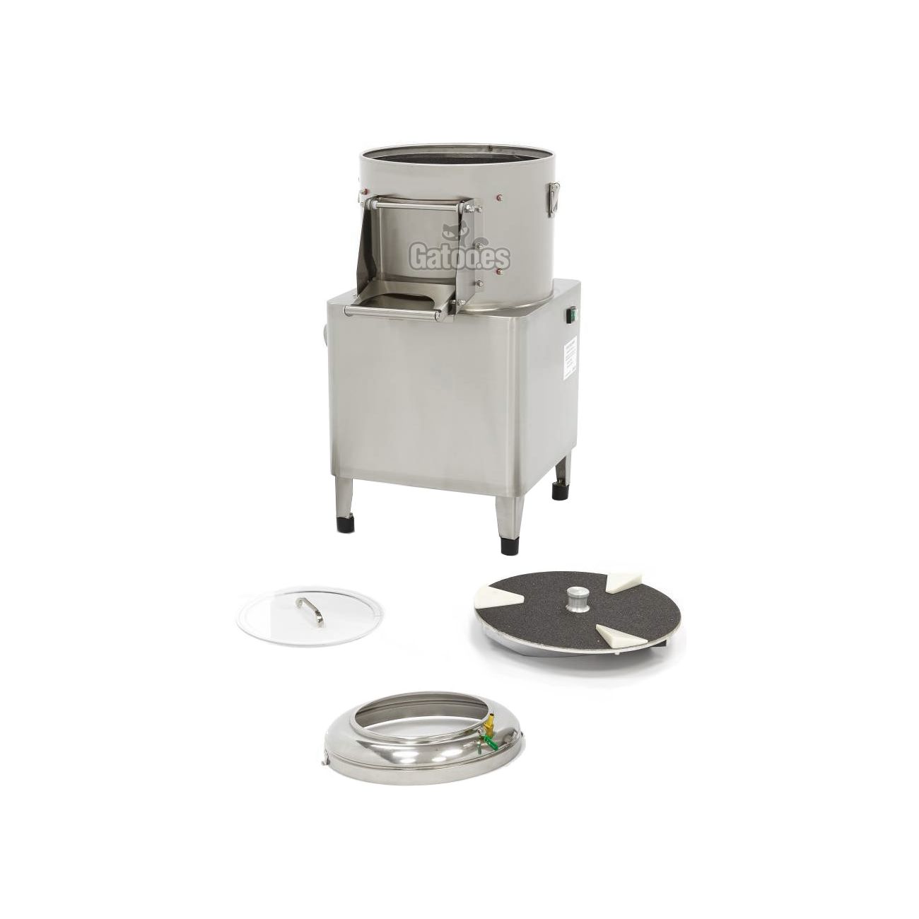 Es un pelador de patatas industrial con carcasa, recipiente y puerta construidos en Acero Inoxidable. Destinada para negocios de hostelería de bares, restaurantes y bufets que tienen un nivel alto de trabajo en sus cocinas y necesitan ahorrar tiempo a la hora de pelar hortalizas. En un ciclo de 2-3 minutos con el recipiente lleno pela hasta 8 kilos de patatas, zanahorias, nabos, remolachas, etc., llegando hasta una producción de 160 kilos por hora.