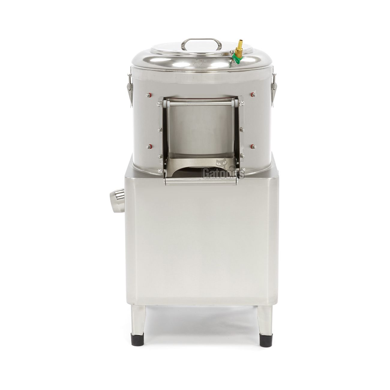 Equipada con conexión de entrada y salida de agua separadas, una por arriba y otra por abajo también para los desechos. Su tapa transparente permite visualizar en todo momento el proceso de pelado.